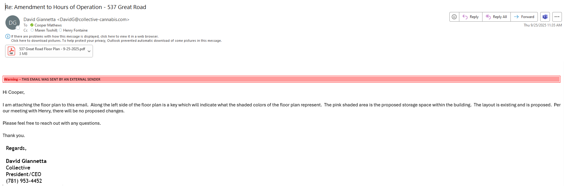 Request to Amend Hours of Operation -  10/2/25 PB Meeting